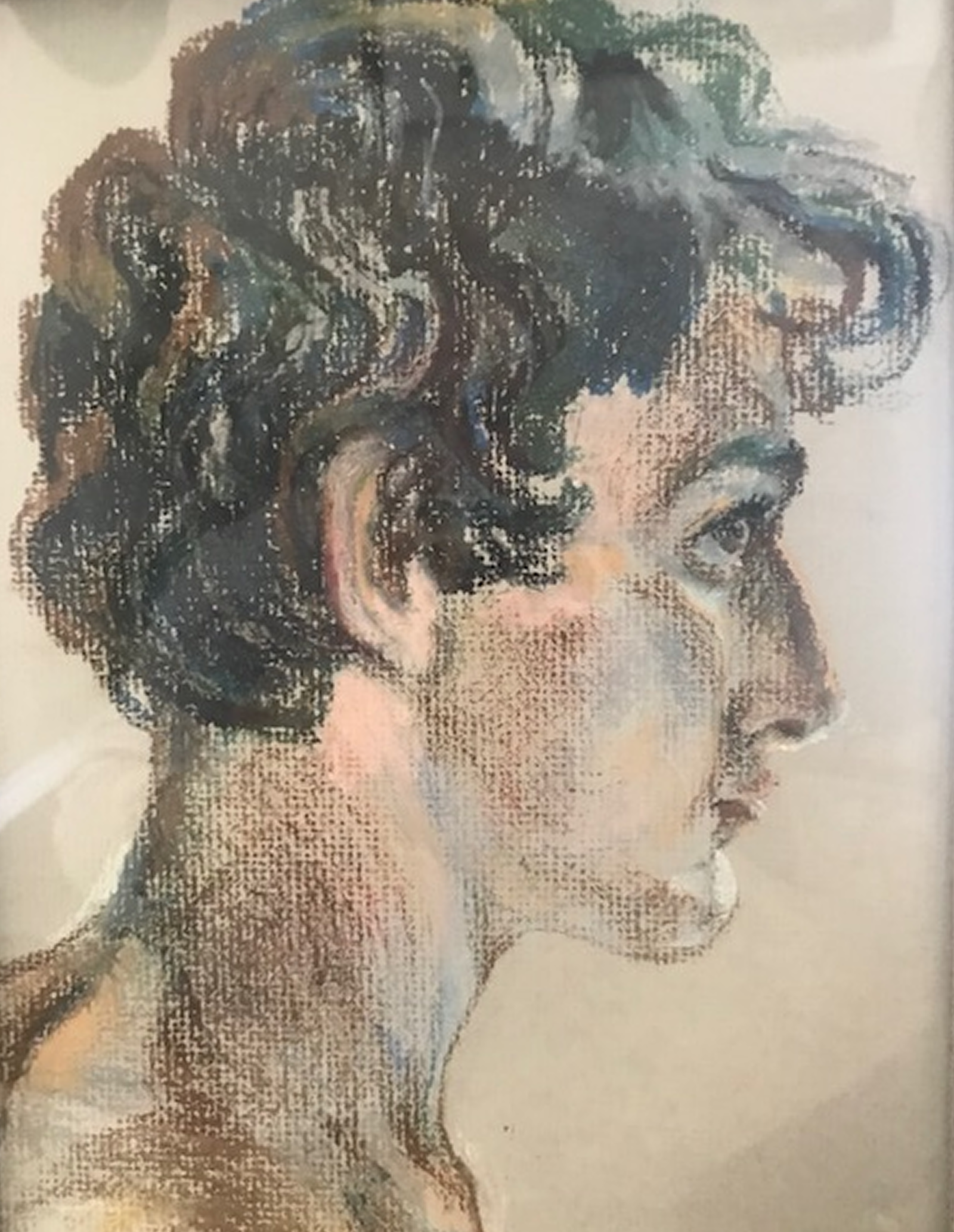 Valeriya Veron works the intimate 10″ x 8″ cardboard surface in oil pastel, a medium that suits the subject perfectly. The texture of the cardboard pushes back against the pastel, creating a natural grain that adds vibrancy to every mark. Color moves freely through the composition, soft pinks at the ear and cheek, cool greens threading through the hair, pale light catching the shoulder below. Nothing overstays its welcome. Mark is a portrait of pure artistic confidence, Valeriya Veron working at speed and instinct, trusting the medium and the moment to deliver something true.